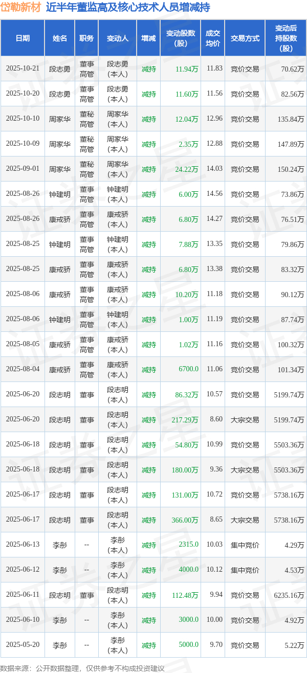 岱勒新材近半年内的董监高及核心技术人员增减持详情如下: