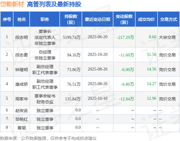 岱勒新材近半年内的董监高及核心技术人员增减持详情如下: