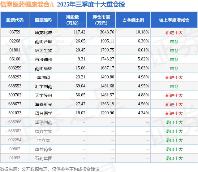 信澳医药健康混合A的前十大重仓股如下: