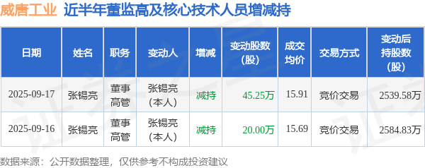 威唐工业:9月17日高管张锡亮减持股份合计45.25万股