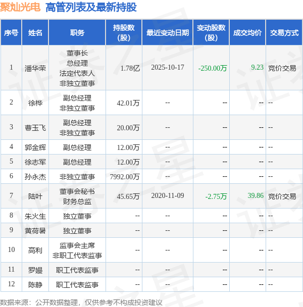 聚灿光电的高管列表及最新持股情况如下: