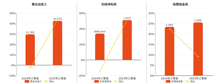 公司营业总收入为22.67亿元。归母净利润为1.51亿元。经营活动现金净流入为2.50亿元。