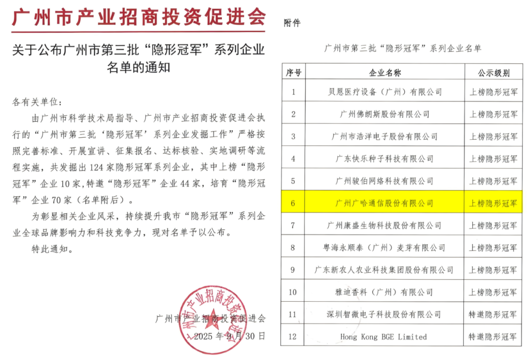 广哈通信入选广州市第三批“隐形冠军”系列企业,以硬核实力铸就细分行业标杆