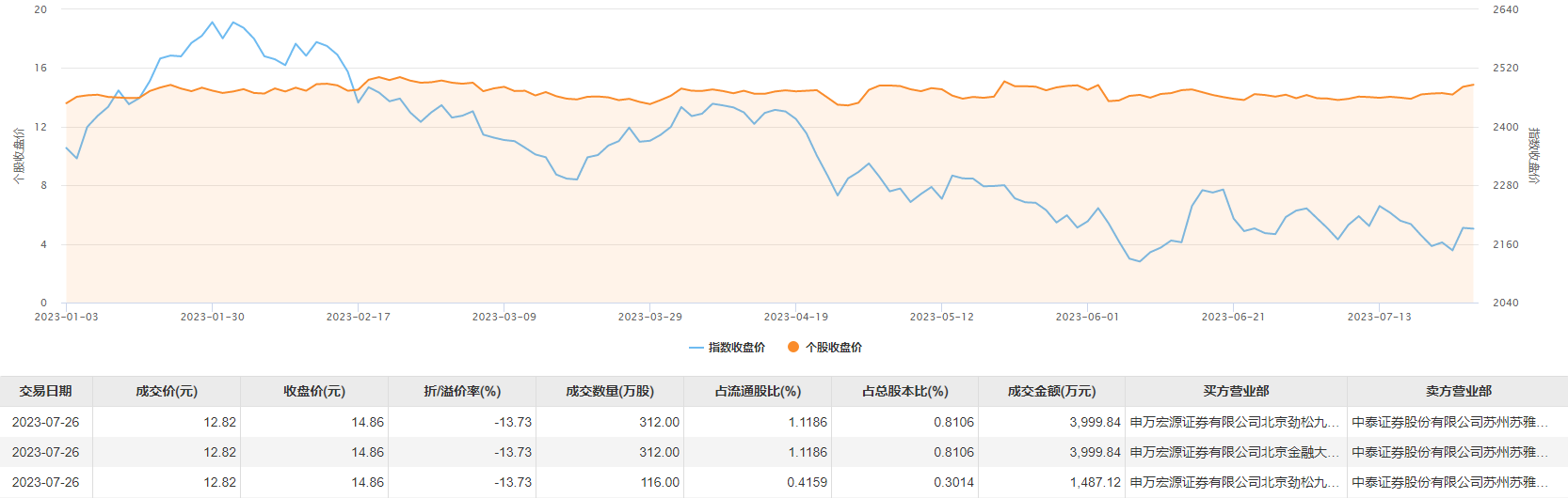 7月26日大宗交易成交740万股,成交额9486.8万元,占当日总成交额的60%,成交价12.82元,较市场收盘价14.86元折价13.73%。