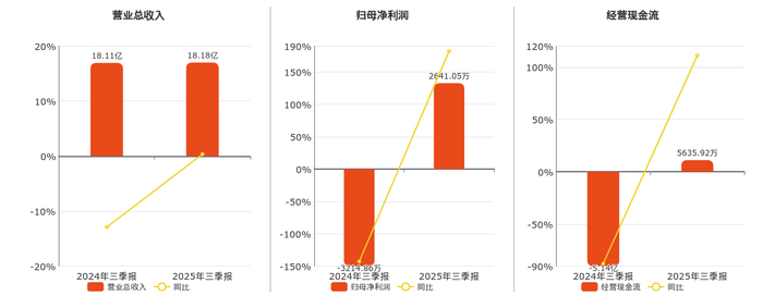 公司营业总收入为18.18亿元。归母净利润为2641.05万元。经营活动现金净流入为5635.92万元。