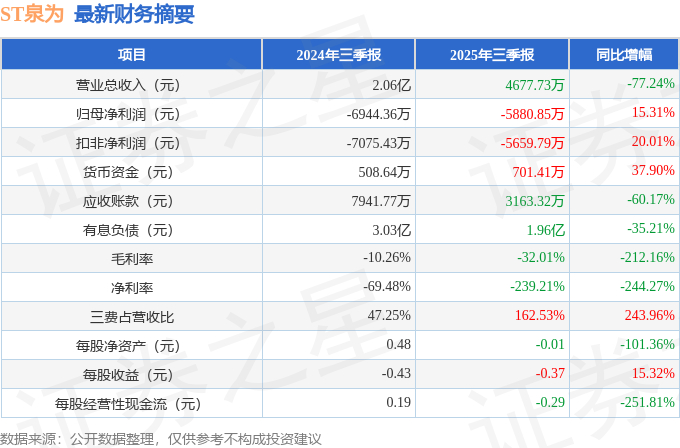 据证券之星公开数据整理,近期ST泉为(300716)发布2025年三季报。截至本报告期末,公司营业总收入4677.73万元,同比下降77.24%,归母净利润-5880.85万元,同比上升15.31%。按单季度数据看,第三季度营业总收入57.33万元,同比下降99.04%,第三季度归母净利润-2201.4万元,同比上升1.87%。本报告期ST泉为三费占比上升明显,财务费用、销售费用和管理费用总和占总营收同比增幅达243.96%。