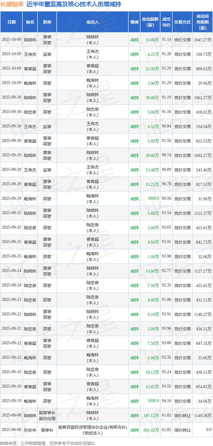 长盛轴承近半年内的董监高及核心技术人员增减持详情如下: