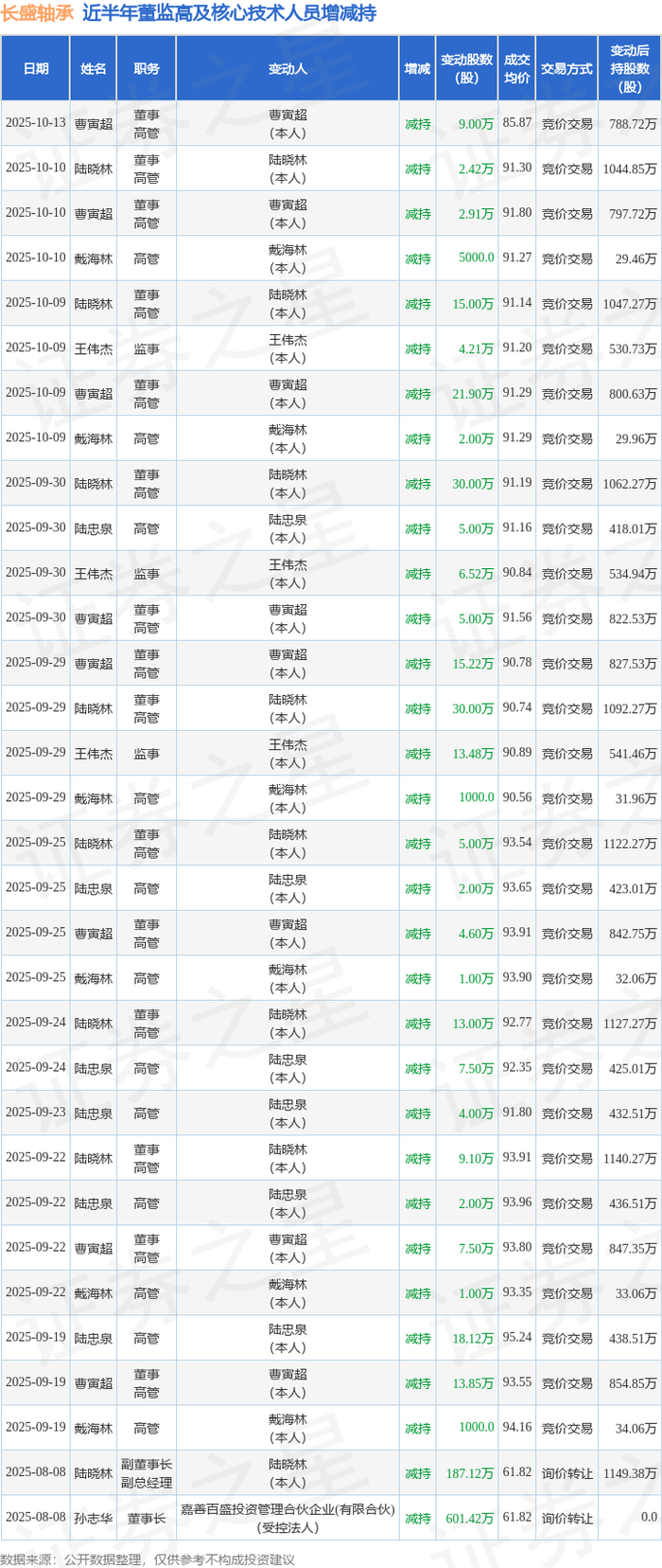 长盛轴承近半年内的董监高及核心技术人员增减持详情如下: