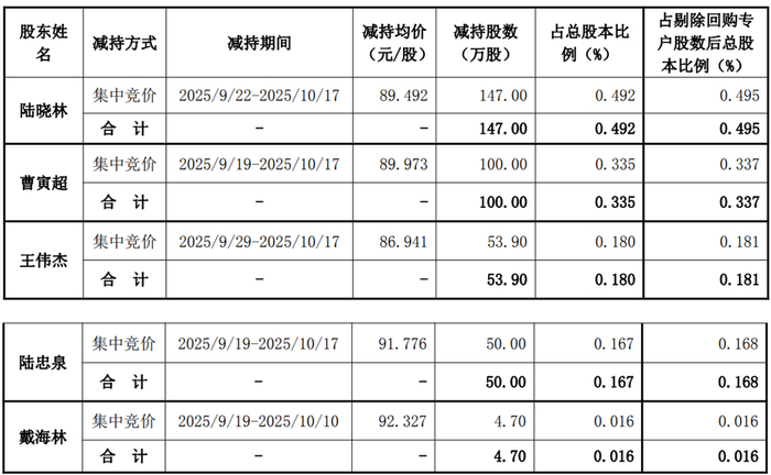 公司副董事长、常务副总经理陆晓林减持147.00万股,套现约1.32亿元;公司董事、副总经理曹寅超减持100.00万股,套现约8997.30万元;公司监事王伟杰减持53.90万股,套现约4686.12万元;公司总工程师陆忠泉减持50.00万股,套现约4588.80万元;公司副总经理戴海林戴海林减持4.7万股,套现约433.94万元。