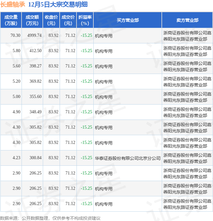 12月5日长盛轴承现12笔折价15.25%的大宗交易 合计成交8415.65万元