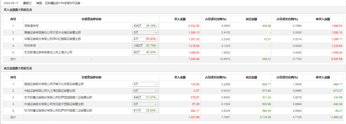 5月17日,新余国科今日涨停,龙虎榜数据显示,上榜营业部席位全天成交1.15亿元,占当日总成交金额比例为19.92%。其中,买入金额为8311.75万元,卖出金额为3162.29万元,合计净买入5149.47万元。