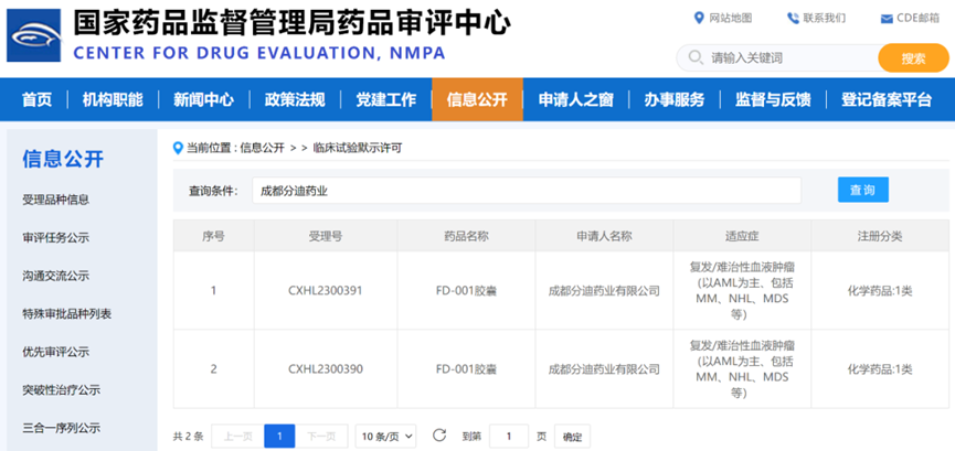 近日,由一品红(证券代码:300723)参股公司成都分迪药业有限公司(简称:分迪药业)提交的首个以分子胶技术开发的双靶点分子胶新药FD-001胶囊新药临床试验申请(IND)获国家药品监督管理局默示许可(受理号:CXHL2300390和CXHL2300391),适应症为急性髓系白血病(AML)、多发性骨髓瘤(MM)和非霍奇金淋巴瘤(NHL)等血液肿瘤的治疗。