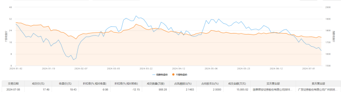 7月8日大宗交易成交908.28万股,成交额1.59亿元,占当日总成交额的80.41%,成交价17.49元,较市场收盘价19.43元折价9.98%。