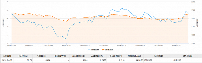 4月30日大宗交易成交59.54万股,成交额4090.26万元,占当日总成交额的5.62%,成交价68.7元,较市场收盘价68.7元持平。