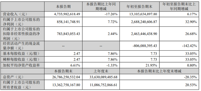 报告显示,捷佳伟创公司前三季度营业收入为131.06亿元,同比增长6.17%;归母净利润为26.88亿元,同比增长32.90%;扣非归母净利润为24.63亿元,同比增长26.68%;基本每股收益7.73元。