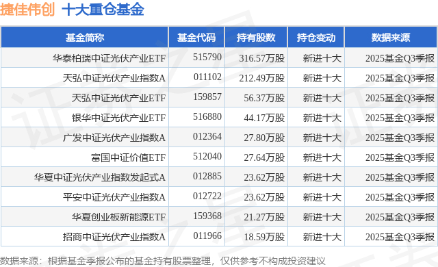 根据2025基金Q3季报公募基金重仓股数据,重仓该股的公募基金共27家,其中持有数量最多的公募基金为华泰柏瑞基金的华泰柏瑞中证光伏产业ETF。华泰柏瑞中证光伏产业ETF目前规模为139.76亿元,最新净值0.9826(11月20日),较上一交易日下跌1.89%,近一年上涨15.34%。该公募基金现任基金经理为李茜 李沐阳。李茜在任的基金产品包括:华泰柏瑞上证红利ETF,管理时间为2019年11月5日至今,期间收益率为54.75%;华泰柏瑞中证港股通50ETF,管理时间为2020年12月30日至今,期间收益率为17.24%;华泰柏瑞中证物联网主题ETF,管理时间为2021年3月31日至今,期间收益率为31.76%。李沐阳在任的基金产品包括:华泰柏瑞光伏ETF联接A,管理时间为2021年8月17日至今,期间收益率为-38.66%;华泰柏瑞中韩半导体ETF(QDII),管理时间为2022年11月2日至今,期间收益率为134.11%;华泰柏瑞纳斯达克100ETF(QDII),管理时间为2023年3月1日至今,期间收益率为99.85%。
