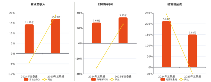公司营业总收入为14.04亿元。归母净利润为3.27亿元。经营活动现金净流入为2.92亿元,较去年同报告期经营活动现金净流入减少1.21亿元,同比较去年同期下降29.28%。