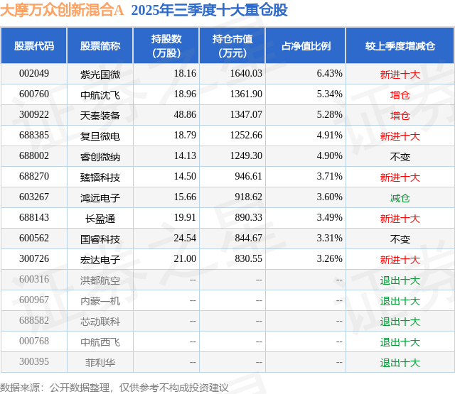 根据2025基金Q3季报公募基金重仓股数据,重仓该股的公募基金共4家,其中持有数量最多的公募基金为摩根士丹利基金的大摩万众创新混合A。大摩万众创新混合A目前规模为0.55亿元,最新净值0.8956(12月23日),较上一交易日下跌0.08%,近一年上涨30.75%。该公募基金现任基金经理为雷志勇 李子扬。