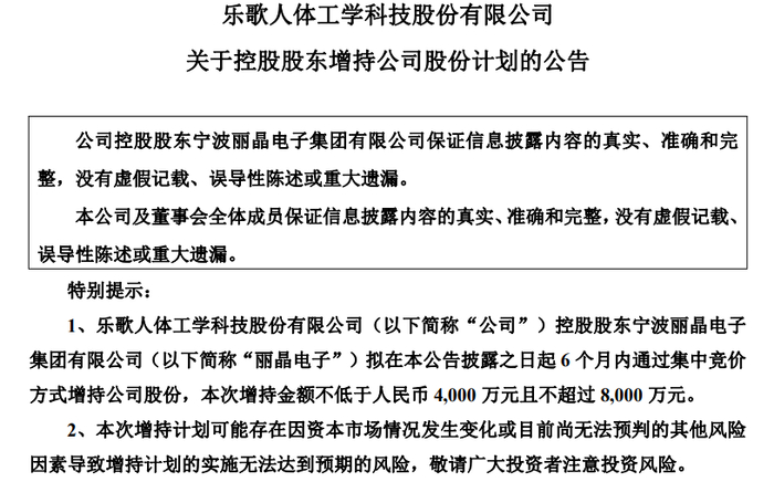 11月24日,乐歌股份(300729.SZ)发布公告,公司控股股东宁波丽晶电子集团有限公司(简称“丽晶电子”)拟在本公告披露之日起6个月内通过集中竞价方式增持公司股份,本次增持金额不低于4000万元且不超过8000万元。