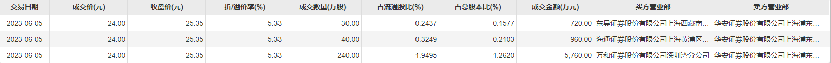 6月5日大宗交易成交310万股,成交额7440万元,占当日总成交额的28.19%,成交价24元,较市场收盘价25.35元折价5.33%。