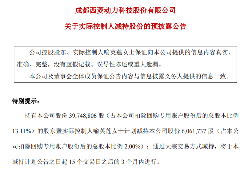 西菱动力:实际控制人喻英莲拟减持不超2%股份,不会导致公司控制权发生变更