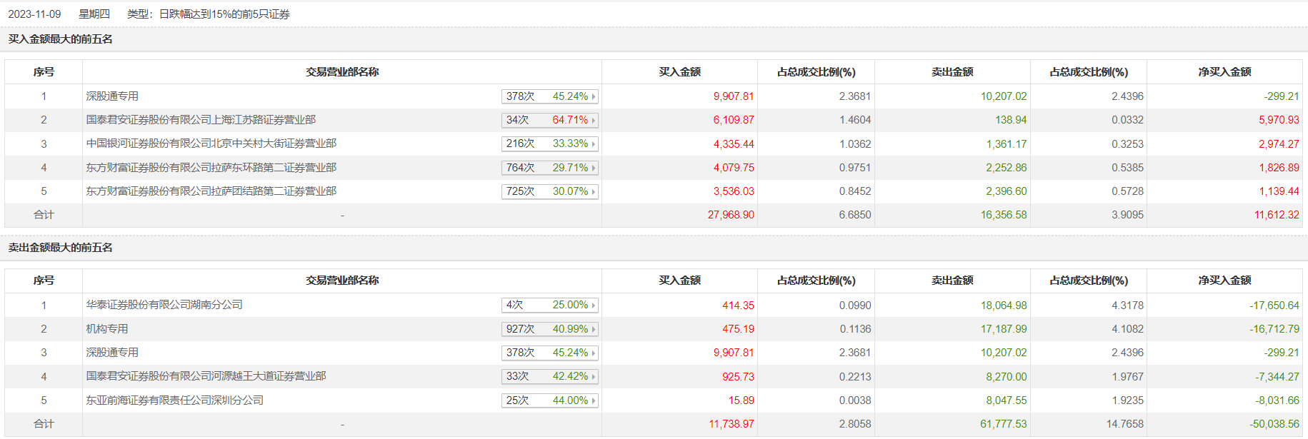 光弘科技11月9日跌停,龙虎榜数据显示,上榜营业部席位全天成交9.77亿元,占当日总成交金额比例为23.36%。其中,买入金额为2.98亿元,卖出金额为6.79亿元,合计净卖出3.81亿元。