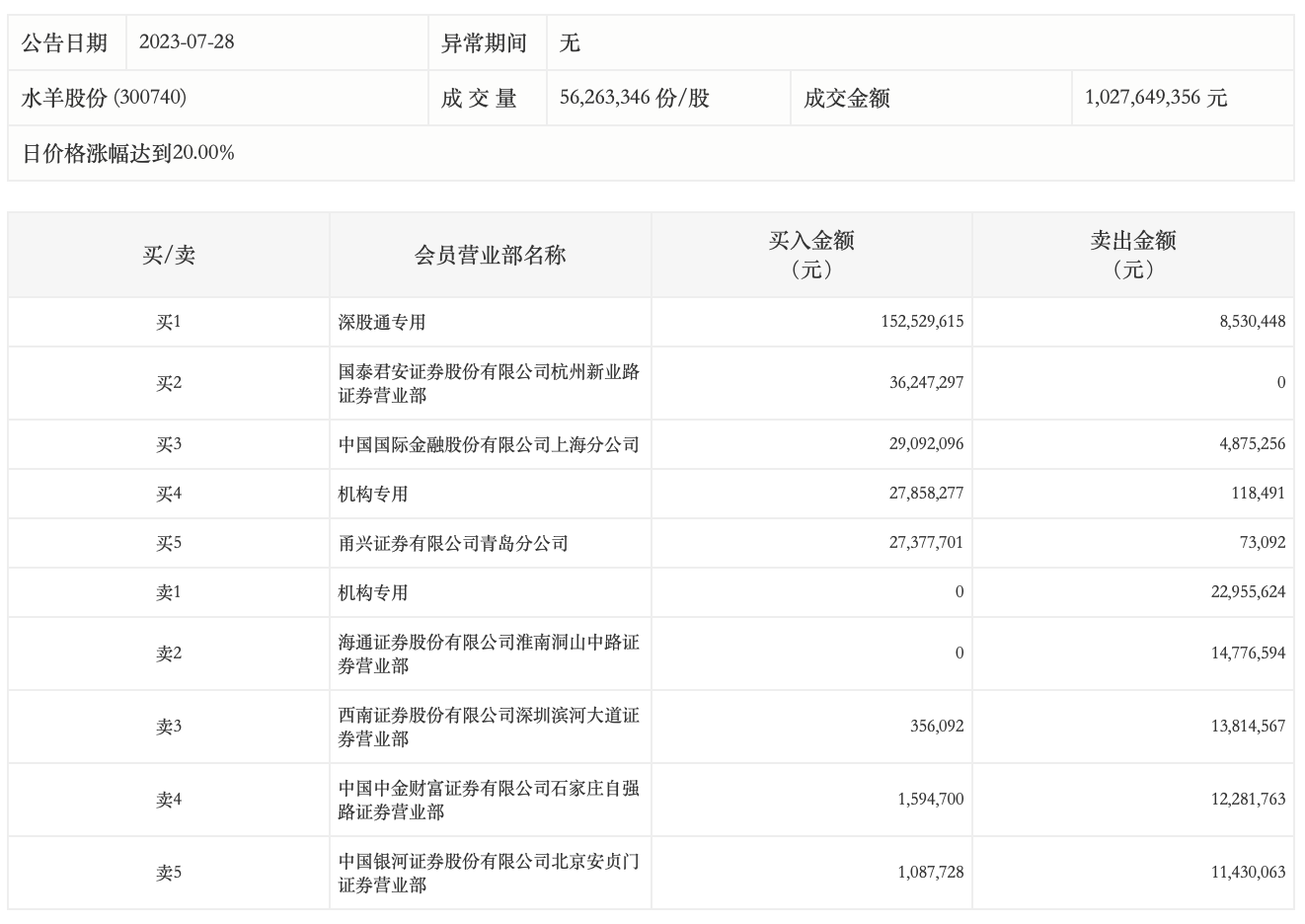 7月28日,水羊股份今日涨停,龙虎榜数据显示,上榜营业部席位全天成交3.65亿元,占当日总成交金额比例为35.52%。其中,买入金额为2.76亿元,卖出金额为8885.59万元,合计净买入1.87亿元。