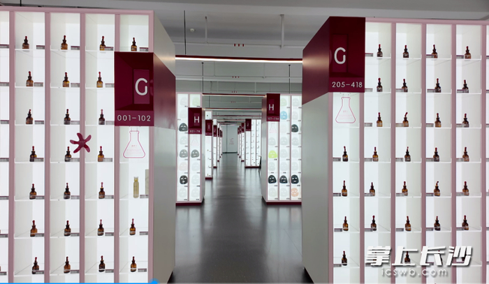 第一个场景是“配方图书馆”。在一个宽大、洁净的空间里,整齐排列着一排排柜子。柜子都做成格子架的款式,每一个格子里放着一个小瓶子,并详细注明原料、类型等信息。这些瓶子里装的就是该品牌自主研发的配方样本,涵盖面膜、乳霜等各类美妆产品,总计有8000多个样本。
