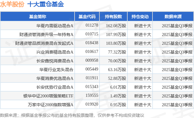 根据2025基金Q3季报公募基金重仓股数据,重仓该股的公募基金共10家,其中持有数量最多的公募基金为华夏基金的华夏内需驱动混合A。华夏内需驱动混合A目前规模为13.65亿元,最新净值0.5154(12月30日),较上一交易日上涨0.1%,近一年下跌2.79%。该公募基金现任基金经理为季新星 徐漫。季新星在任的基金产品包括:华夏消费优选混合A,管理时间为2021年5月21日至今,期间收益率为-41.95%。徐漫在任的基金产品包括:华夏消费臻选混合发起式A,管理时间为2023年2月21日至今,期间收益率为11.8%;华夏港股前沿经济混合(QDII)A,管理时间为2025年3月12日至今,期间收益率为4.84%;华夏品质生活混合A,管理时间为2025年7月22日至今,期间收益率为-0.41%;