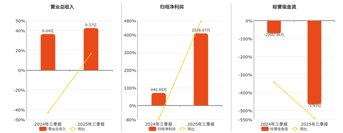 公司营业总收入为9.37亿元。归母净利润为2536.07万元。经营活动现金净流入为-1.41亿元,在已披露的同业公司中排名第32,较去年同报告期经营活动现金净流入减少1.19亿元。
