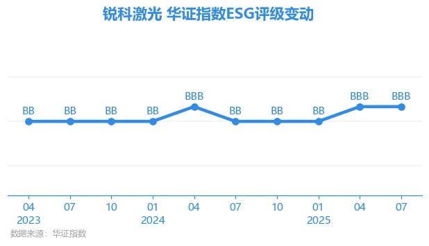 日前,华证指数公布了新一期(2025年7月31日)的ESG评级结果,锐科激光(300747.SZ)获得BBB评级(华证指数评级为C起至AAA九档,C为最低档,AAA为其最高一级评级/AA为其第二档),上一期(2025年4月30日)ESG评级为BBB。本期ESG评级在529家电子设备、仪器和元件行业A股上市公司中排名第100(上一期排名第97)。