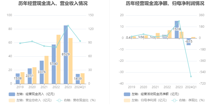 2024年第一季度,公司营业收入现金比为93.64%,净现比为-604.94%。