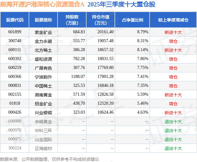 前海开源沪港深核心资源混合A的前十大重仓股如下: