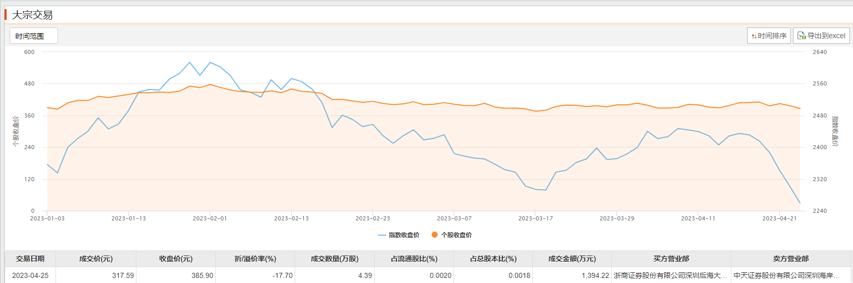 4月25日大宗交易成交4.39万股,成交额1394.22万元,占当日总成交额的0.21%,成交价317.59元,较市场收盘价385.9元折价17.7%。