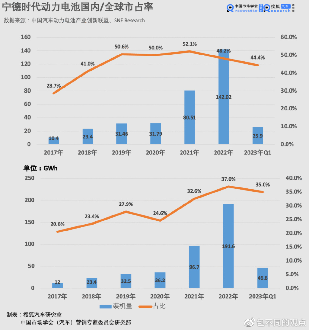 过去很长一段时间乃至今天,宁德时代都是电池行业的巨无霸,全球市场占比排在第一。但这种地位,似乎正在发生动摇。SNE Research数据显示,2022年宁德时代全球市占率达到了37%,而今年一季度的市占率却下降至35%。