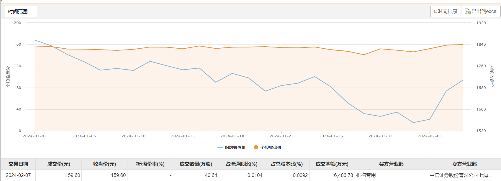 今日大宗交易成交40.64万股,成交额6486.78万元,占当日总成交额的1.11%,成交价159.60元,较市场收盘价持平。