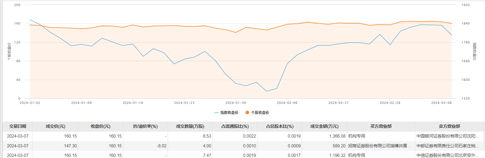 宁德时代3月7日大宗交易成交20万股,成交额3151.6万元,占当日总成交额的0.88%,成交均价157.58元,较市场收盘价160.15元折价1.6%,其中最高成交价160.15元,最低成交价147.3元。