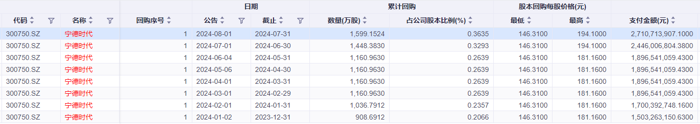 而在7月1日,宁德时代曾披露,截至6月30日回购股份1448.38万股,成交金额为24.46亿元。南财快讯记者据此计算,宁德时代7月份回购股份数量为150.77万股,回购金额达2.65亿元。