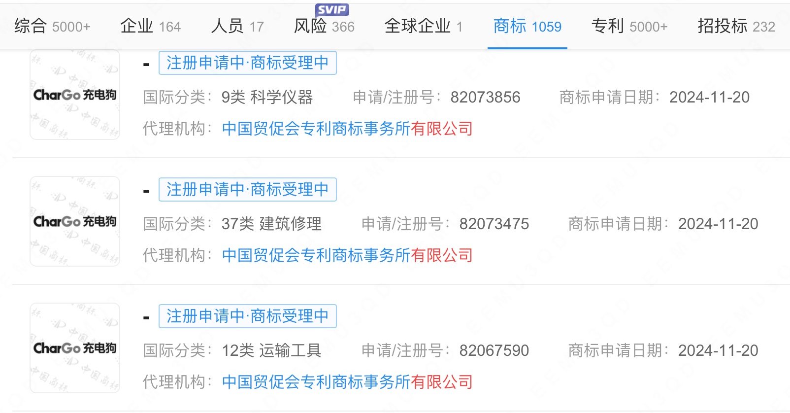申请注册3枚“CharGo充电狗”商标,国际分类为运输工具、科学仪器、建筑修理,当前商标状态均为注册申请中。