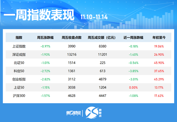 本周(11月10日至14日)五个交易日内,三大指数均下跌,沪指跌0.18%,深成指跌1.40%,创业板指跌3.01%。