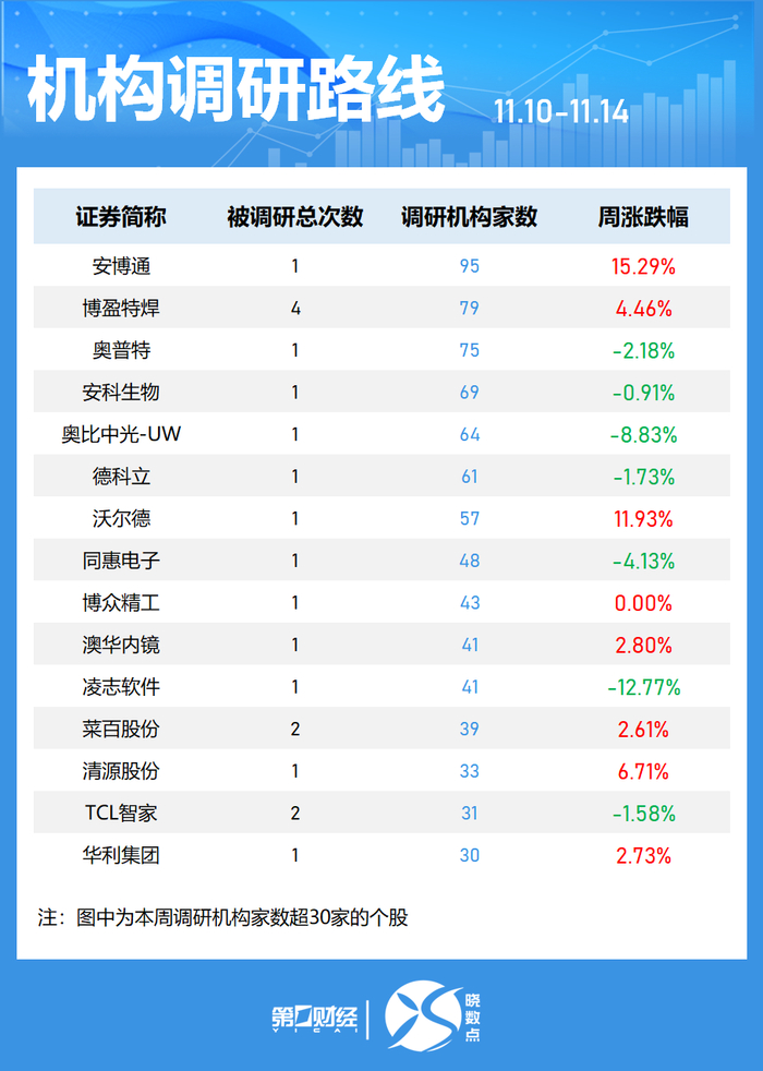 Wind数据显示,机构本周(11月10日至11月14日)共调研了346家上市公司,其中安博通最获关注,参与调研的机构达95家。博盈特焊、奥普特、安科生物分别获79、75、69家机构调研。