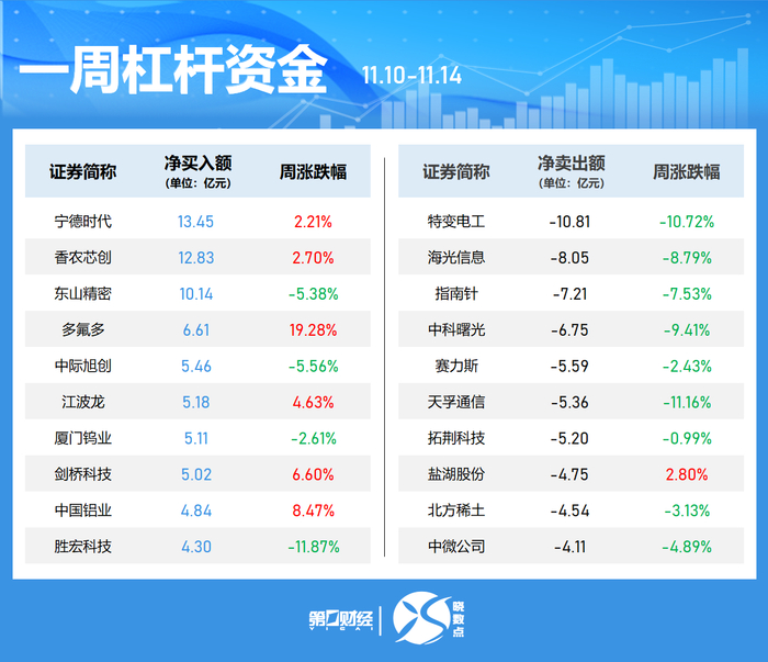 宁德时代本周获融资净买入居首,净买入额为13.45亿元,周涨幅2.21%。香农芯创、东山精密、多氟多获净买入额居前;特变电工、海光信息、指南针遭净卖出额居前,金额分别为10.81亿元、8.05亿元、7.21亿元。