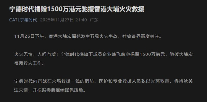【宁德时代捐赠 1500 万港元驰援香港大埔火灾救援】11 月 26 日下午,香港大埔宏福苑发生五级火灾事故。宁德时代携旗下成员企业峰飞航空捐赠 1500 万港元,驰援大埔宏福苑救灾工作。