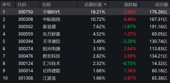 创业板ETF汇添富(159247)标的指数权重股多数收红:宁德时代、阳光电源、胜宏科技涨超2%,东方财富涨超1%,中际旭创微涨。