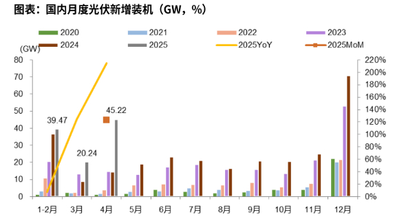 设备类企业,是本轮光伏周期中最晚被波及到的环节。虽然2025上半年国内出现了抢装潮,1-4月份累计光伏装机量为104.9GW,同比增速达到75%。