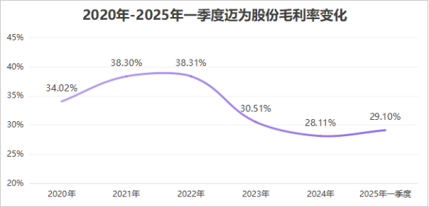 2024年到2025年一季度,迈为股份毛利率从28.11%增长至29.1%,虽然无法与2022年接近40%的毛利率相较,能维持在30%也是很不错的水平了。