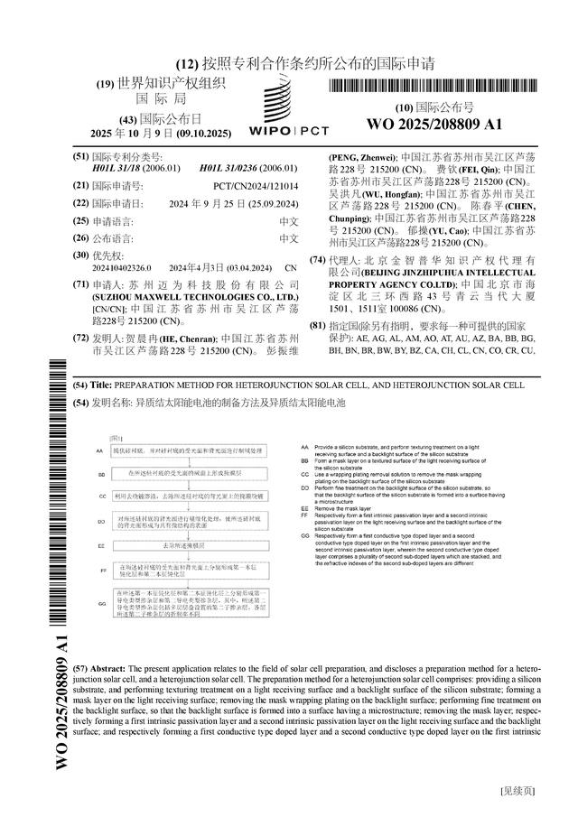 迈为股份公布国际专利申请:“异质结太阳能电池的制备方法及异质结太阳能电池”