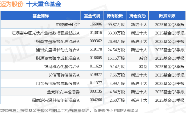 重仓迈为股份的前十大公募基金请见下表: