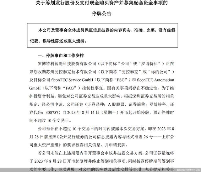 罗博特科最新公告显示,公司正在筹划收购斐控泰克及目标公司FSG和FAG控制权事宜。因有关事项尚存在不确定性,为了维护投资者利益,避免对公司证券交易造成重大影响,根据深交所的相关规定,经公司申请,公司证券自8月14日开市起开始停牌,预计停牌时间不超过10个交易日。