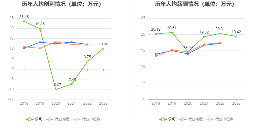 截至2023年末,公司员工总数为767人,人均创收204.89万元,人均创利10.06万元,人均薪酬19.42万元,较上年同期分别变化58.12%、168.13%、-4.38%。